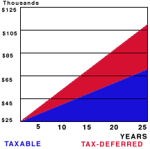 To illustrate the increased earnings capacity of tax-deferred interest, compare it to a fully-taxable earnings. $25,000 at 6.0% will earn $1,500 of interest in a year. A 28% tax bracket means that approximately $420 of those earnings will be lost in taxes, leaving only $1,080 to compound the next year. If these same earnings were tax-deferred, the full $1,500 would be available to earn even more interest. The longer you can postpone taxes, the greater the gain.